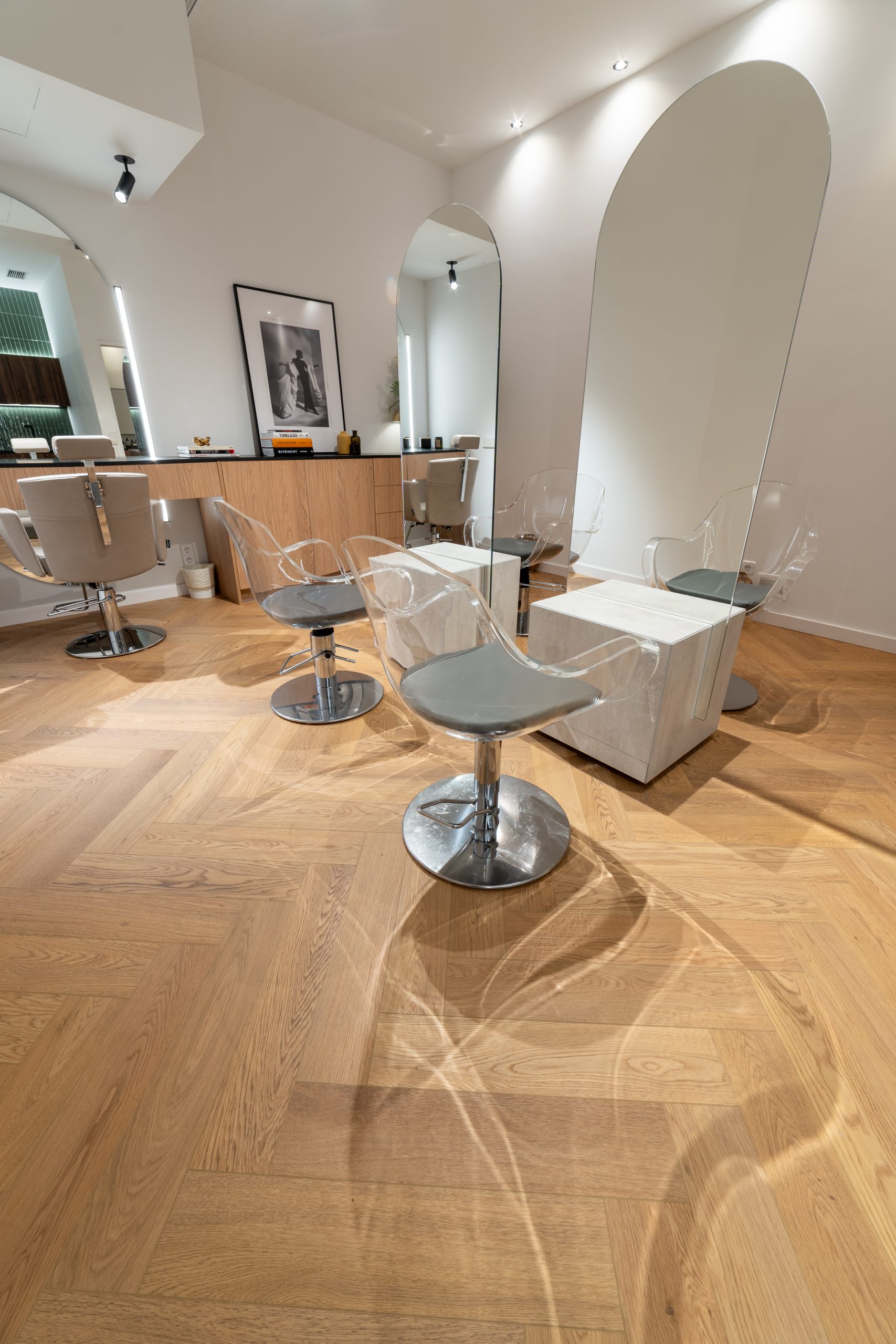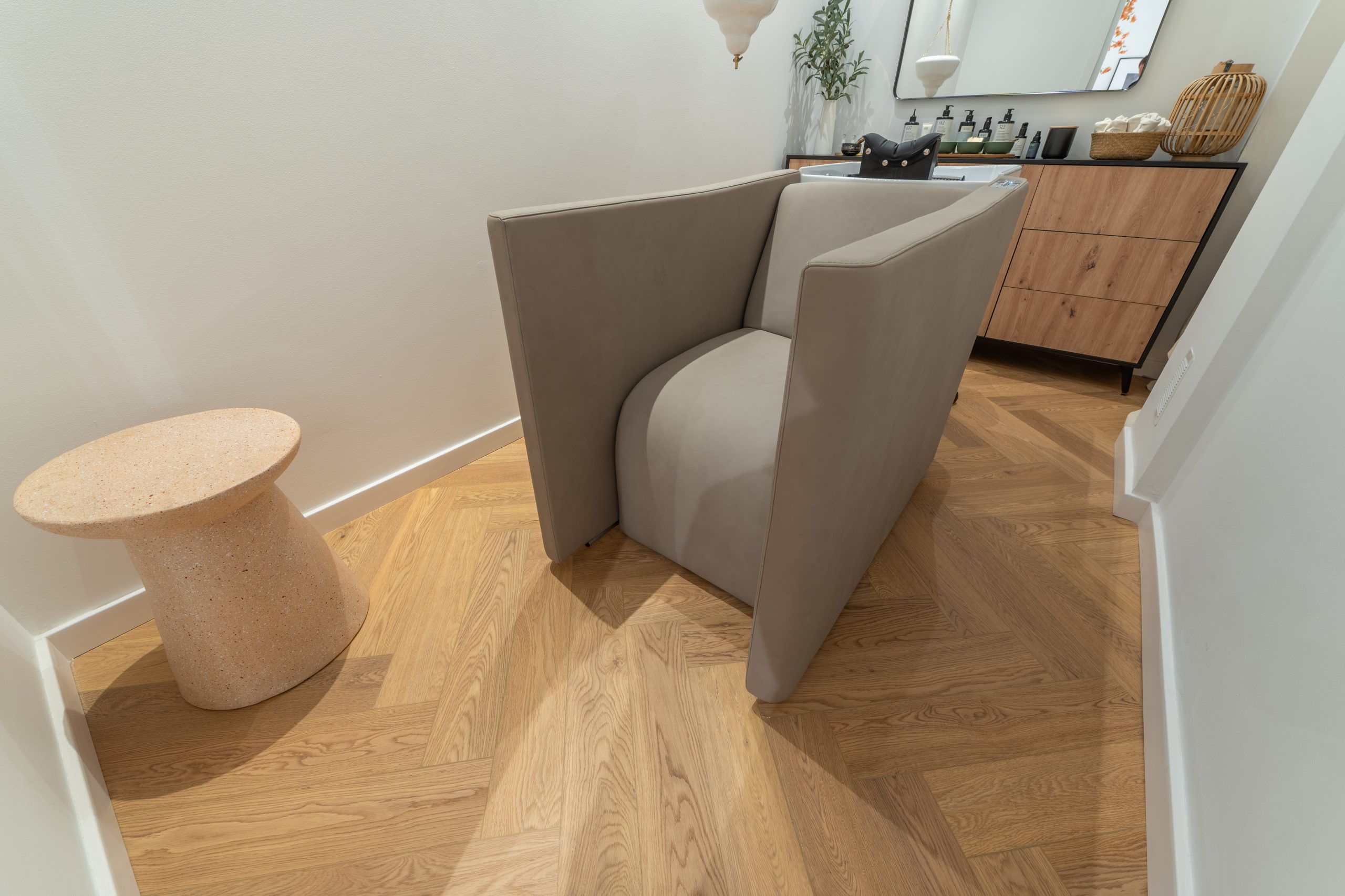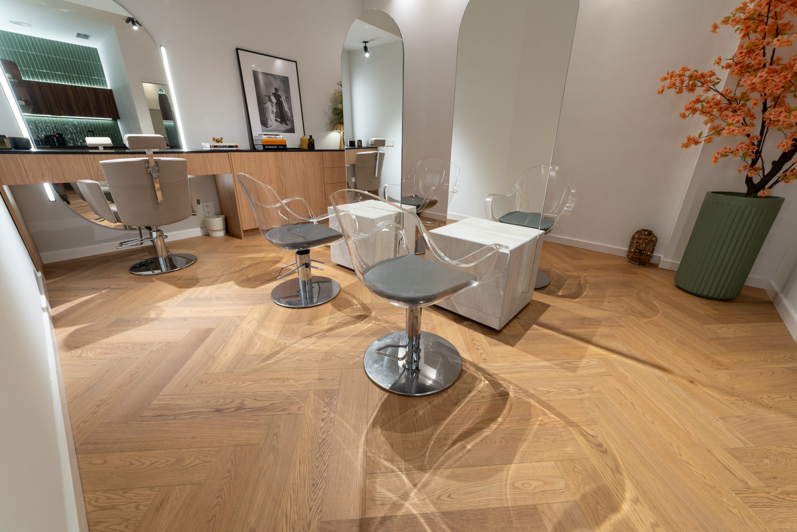 For this hair salon located in Barcelona, we installed the Cierzo model from the Ynova digital printing collection, covering both the kitchen area and the entire salon floor. The priority was finding a surface that could stand up to daily wear in a busy, high-traffic environment without sacrificing style.
